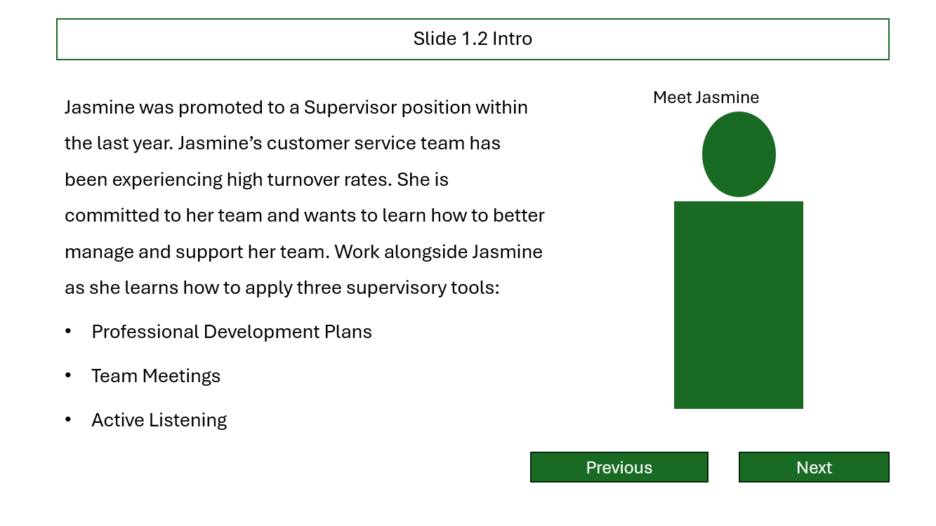 I developed the eLearning with Articulate Storyline. Applying Merril's Principles of Instruction, I wanted learners to be immersed in solving real-world problems and have the opportunity to work through situation-based problems alongside the supervisor in the training. Using visual role plays, learners were able to see situations they may have experienced in the workplace, drawing on prior knowledge and experience. I built tabbed interactions to allow learners to process information in a manageable and interactive manner. Visual demonstrations with click to reveal participation portrayed the parts of active listening. I utilized multiple choice questions to allow learners to define SMART goals; drag and drop to allow for completing an agenda; and branching scenarios to exercise decision making.